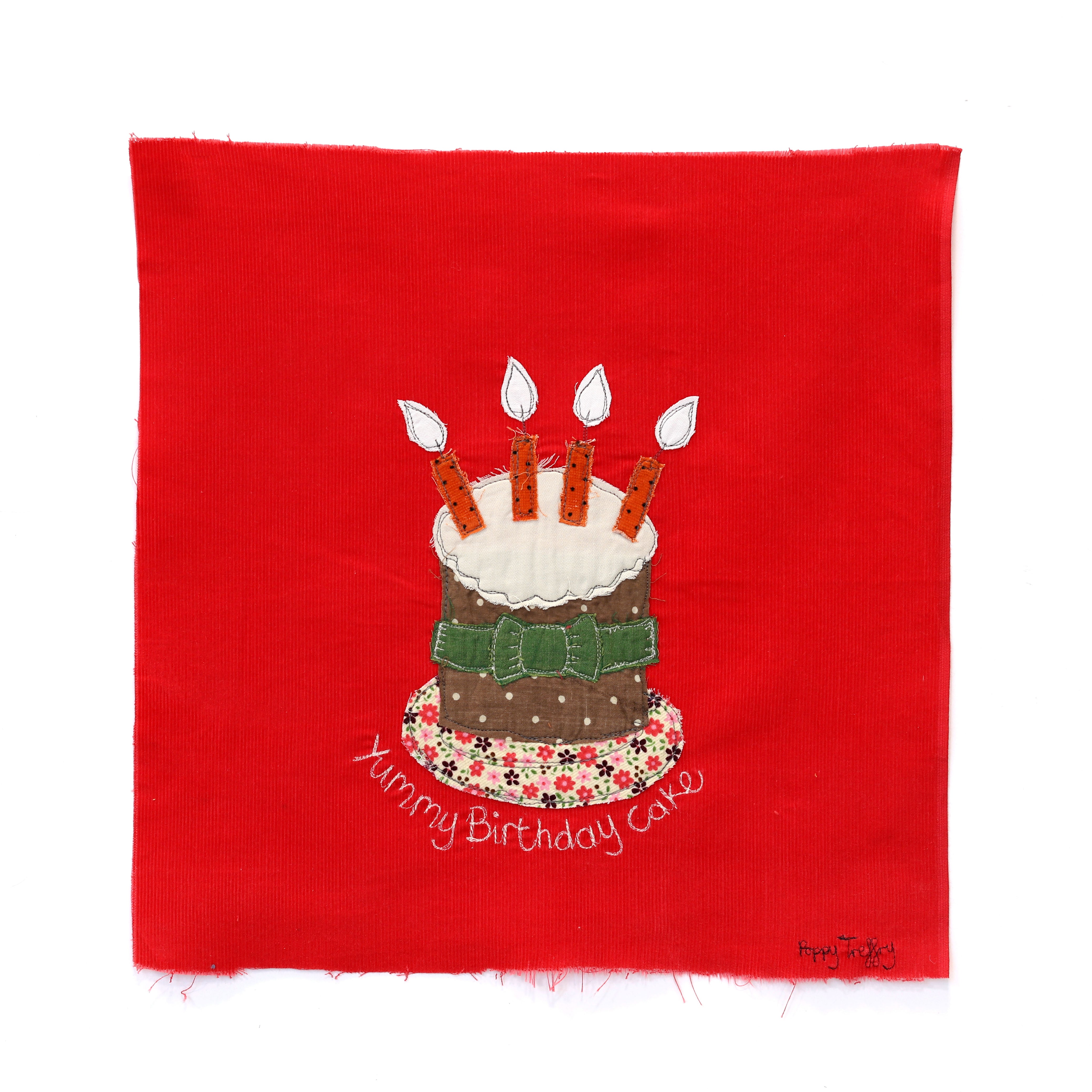 This design has been hanging around in the archive for over 15 years. The original embroidery was first made for a greeting card design and is made on a lush, red needle cord and feature a range of Poppy’s favourite appliqué fabrics (of which there are only the tiniest scraps left of now!). If you're looking for a birthday gift that is too good to eat, this yummy design is ideal.
